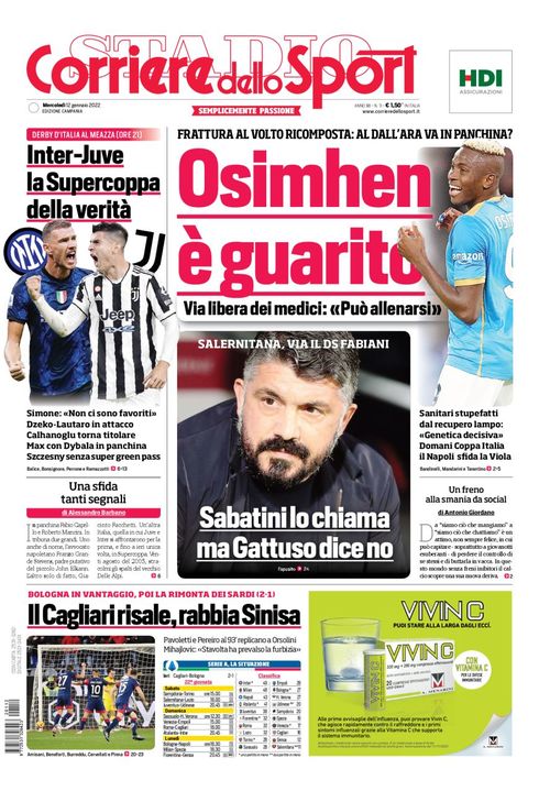"Osimhen e' guarito! Salernitana: Sabatini chiama Gattuso ma dice no", ecco la prima pagina dell'edizione Campania del Corriere dello Sport.