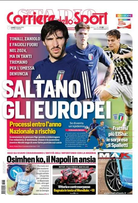 Il Corriere dello Sport, edizione Campania, dedica spazio in prima pagina al caso scommesse: "Saltano gli europei. Tonali, Zanioli e Fagioli fuori nel 2024, ma in tanti tremano per l'omessa denuncia. Processi entro l'anno. Nazionale a rischio". C'è spazio anche per il Napoli: "Osimhen ko, il Napoli in ansia. Oggi gli esami chiariranno l'entità dlel'infortunio con la Nigeria".