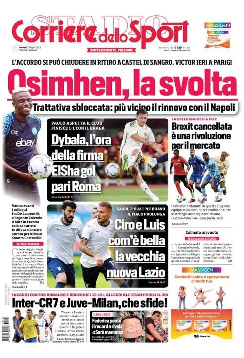 Il Corriere dello Sport, nell'edizione campana, apre con "Osimhen, la svolta". Trattativa sbloccata: più vicino il rinnovo con il Napoli. L'accordo si può chiudere in ritiro a Castel di Sangro, Victor ieri a Parigi. Vanno avanti i colloqui fra De Laurentiis e l'agente Calenda. Il blitz in Francia solo da turista. In difesa si insiste ancora per Kilman. Spunta Castrovilli.