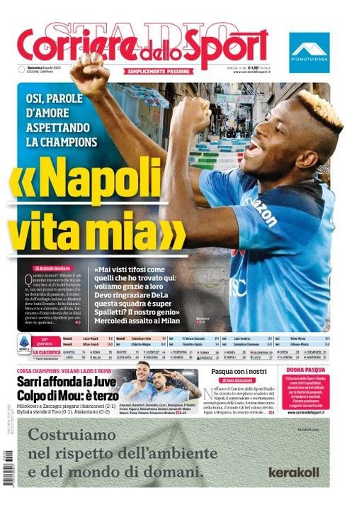 Il Corriere dello Sport, nell'edizione campana, apre con l'intervista di Osimhen: "Napoli vita mia". Osi, parole d'amore aspettando la Champions: "Mai visti tifosi come quello che ho trovato qui: voliamo grazie a loro. Devo ringraziare DeLa, questa squadra è super. Spalletti? Il nostro genio". Mercoledì l'assalto al Milan.