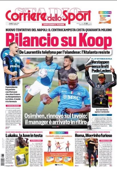 Il Corriere dello Sport, edizione Campania, dedica spazio in prima pagina al Napoli: "Rilancio su Koop. Nuovo tentativo del Napoli: il centrocampista costa 40 milioni. De Laurentiis telefona per l'olandese: l'Atalanta resiste", c'è spazio anche per il possibile rinnovo di Osimhen: "Osimhen, rinnovo sul tavolo: il manager è arrivato in ritiro".