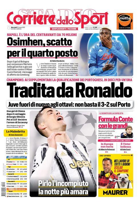 "Osimhen, scatto per il quarto posto", così apre la prima pagina il quotidiano Il Corriere dello Sport nella sua edizione Campania. "Napoli, è ora del centravanti da 70 milioni. dopo il gol al Bologna può sorpassare Mertens nelle gerarchie e giocare dall'inizio contro il Milan. Cuore Hamsik: messaggi di affetto da Goteborg".