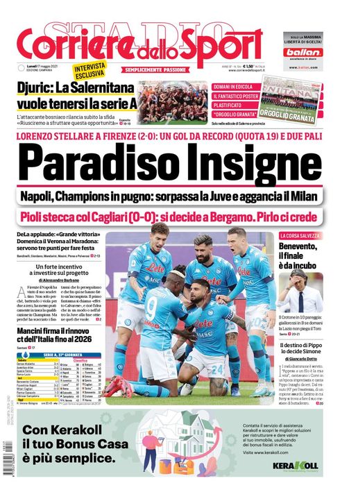 "Paradiso Insigne", titola così la prima pagina del quotidiano Il Corriere dello Sport nella sua edizione Campania. "Lorenzo stellare a Firenze (0-2): un gol da record (quota 19) e due pali", commenta il giornale, che poi si sofferma sulla corsa Champions: "Napoli, Champions in pugno: sorpassa la Juve e aggancia il Milan", "Pioli stecca col Cagliari (0-0): si decide a Bergamo. Pirlo ci crede".