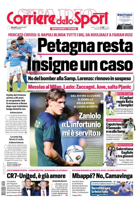 Il Corriere dello Sport, nella sua edizione Campania, apre in prima pagina con il calciomercato del Napoli: “Petagna resta, Insigne un caso. Mercato chiuso: il Napoli blinda tutti i big, da Koulibaly a Fabian Ruiz. No del bomber alla Samp. Lorenzo: rinnovo in sospeso".