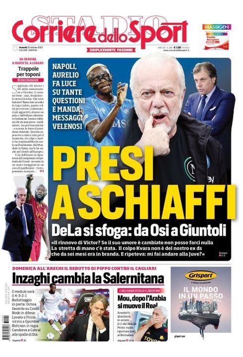 Il Corriere dello Sport, nell'edizione campana, apre con "Presi a schiaffi". Napoli, Aurelio fa luce su tante questioni e manda messaggi velenosi. DeLa si sfoga: da Osi a Giuntoli. "Il rinnovo di Victor? Se il suo umore è cambiato non posso farci nulla. La stretta di mano c'è stata. Il colpo Kvara non è del nostro ex d.s. che da sei mesi era in branda. E ripeteva: "Mi fai andare alla Juve?". In basso, "Inzaghi cambia la Salernitana". Il modulo sarà il 4-3-2-1. Ballottaggio in porta: Ochoa favorito su Costil. Nodo in difesa: Levato o Pirola vicino a Gyomber. Bohinen in regia. Candreva e Cabral alle spalle di Dia. Poi la Roma, con il futuro dell'allenatore giallorosso "Mou, dopo l'Arabia si muove il Real".