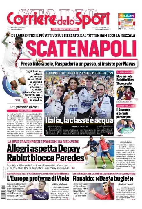 Il Corriere dello Sport, edizione Campania, dedica spazio in prima pagina al calciomercato del Napoli: "Scatenapoli. De Laurentiis il più attivo sul mercato: dal Tottenham ecco la mezzala. Preso Ndombele, Raspadori a un passo, si insiste per Navas".