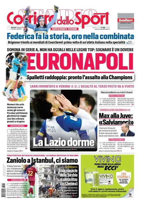 Il Corriere dello Sport, nell'edizione campana, apre con "EuroNapoli". Domina in Serie A, non ha eguali nelle leghe top: sognare è un dovere. Spalletti raddoppia: pronto l'assalto alla Champions. Numeri da urlo, nessuno corre come gli azzurri. Fra due settimane gli ottavi in coppa, con Osi e Kvara pronti a stupire.