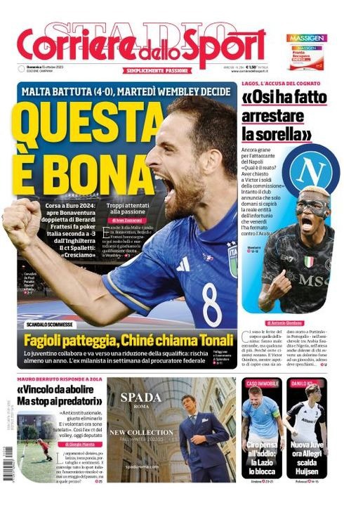Il Corriere dello Sport, nell'edizione campana, apre con "Questa è bona". Malta battuta (4-0), martedì Wembley decide. Corsa a Euro 2024: apre Bonaventura, doppietta di Berardi. Frattesi fa poker. Italia seconda a -3 dall'Inghilterra. Il c.t. Spalletti: "Cresciamo". Fagioli patteggia, Chinè chiama Tonali. Lo juventino collabora e va verso una riduzione della squalifica: rischia almeno un anno. L'ex milanista in settimana dal procuratore federale. Spazio anche alla vicenda Osimhen "Lagos, l'accusa del cognato: "Osi ha fatto arrestare la sorella". In basso, la risposta di Mauro Berruto a Zola: "Vincolo da abolire, ma stop ai predatori". Caso Immobile, Ciro pensa all'addio: la Lazio lo blocca. Nuova Juve, Danilo ko, ora Allegri scalda Huijsen.