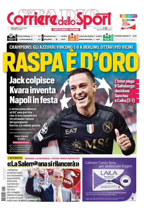 Il Corriere dello Sport, nell'edizione campana, apre parlando della vittoria in Champions League del Napoli contro l'Union Berlino arrivata grazie ad un gol di Giacomo Raspadori: "Raspa è d'oro. Champions: gli azzurri vincono 1-0 a Berlino, ottavi più vicini. Jack colpisce, Kvara inventa: Napoli in festa. L'attaccante sblocca al 65' una partita che si era complicata sfruttando l'assist del georgiano. Garcia: "La rabbia giusta".
