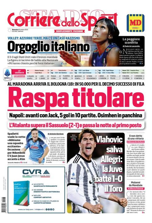 Il Corriere dello Sport, nell'edizione campana, apre con "Raspa titolare". Al Maradona arriva il Bologna (18): in 50.000 per il decimo successo di fila. Napoli: avanti con Jack, 5 gol in 10 partite. Osimhen in panchina. Spalletti vuole la vetta: "Abbiamo una squadra eccitante". Occasione per Ndombele. C'è Juan Jesus accanto a Kim.