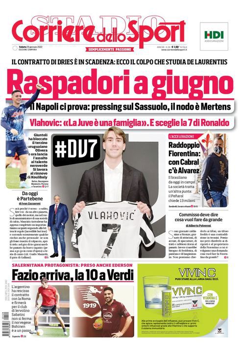 Il Corriere dello Sport, nell'edizione campana, apre con l'interesse del Napoli per Giacomo Raspadori del Sassuolo in vista della prossima stagione: "Raspadori a giugno. Il Napoli ci prova: pressing sul Sassuolo, il nodo è Mertens. Il contratto di Dries è in scadenza: ecco il colpo che studia De Laurentiis".