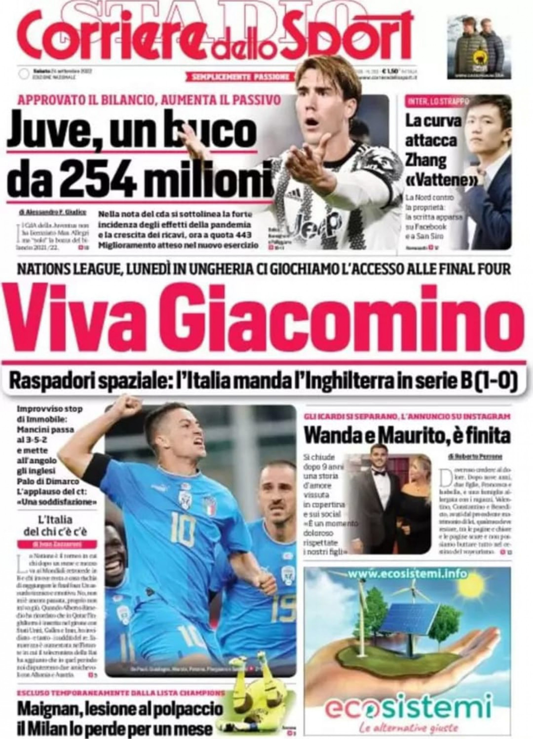 Il Corriere dello Sport, nell'edizione campana, apre con la vittoria dell'Italia in Nations League contro l'Inghilterra arrivata grazie ad un grande gol dell'azzurro Giacomo Raspadori: "Viva Giacomino. Raspadori spaziale: l'Italia manda l'Inghilterra in Serie B (1-0). Nations League, lunedì in Ungheria ci giochiamo l'accesso alle Final Four. Improvviso stop di Immobile: Mancini passa al 3-5-2 e mette all'angolo gli inglesi. Palo di Dimarco. L'appalus del ct: "Una soddisfazione".