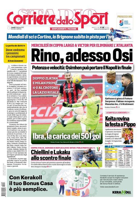 "Rino, adesso Osi. Potenza e velocità: Osimhen può portare il Napoli in finale", titola l'edizione campana del Corriere dello Sport in riferimento alla semifinale di ritorno di Coppa Italia contro l'Atalanta. "Gattuso si gioca il futuro. Sorpresa: Fabian recupera. Manolas ko, c'è Rrahmani", prosegue l'apertura del giornale.
