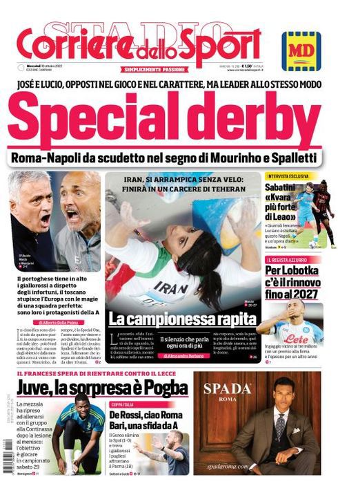 Il Corriere dello Sport, nell'edizione campana, apre con la prossima sfida di campionato tra Roma e Napoli: "Special derby. Roma-Napoli da scudetto nel segno di Mourinho e Spalletti. Josè e Lucio, opposti nel gioco e nel carattere, ma leader allo stesso modo. Il portoghese tiene in alto i giallorossi a dispetto degli infortuni. Il toscano stupisce l'Europa con le magie di una squadra perfetta: sono loro i protagonisti della A".