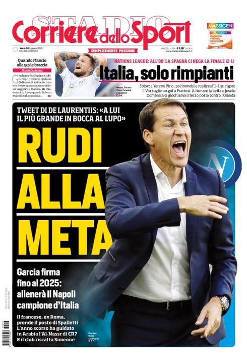 Il Corriere dello Sport, nell'edizione campana, apre con l'annuncio di Rudi Garcia come nuovo allenatore del Napoli: "Rudi alla meta". Tweet di De Laurentiis: "A lui il più grande in bocca al lupo". Garcia firma fino al 2025: allenerà il Napoli campione d'Italia. Il francese, ex Roma, prende il posto di Spalletti. L'anno scorso ha guidato in Arabia l'Al Nassr di Cr7. E il club riscatta Simeone.