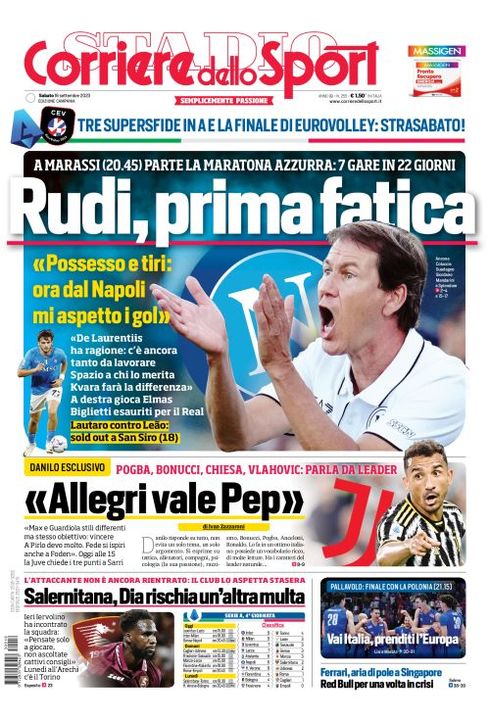 Il Corriere dello Sport, nell'edizione campana, apre parlando del match del Napoli contro il Genoa e del tour de force che gli azzurri affronteranno nel prossimo mese: "Rudi, prima fatica. A Marassi (20:45) parte la maratona azzurra: 7 gare in 22 giorni. "Possesso e tiri: ora dal Napoli mi aspetto i gol". "De Laurentiis ha ragione: c'è ancora tanto da lavorare. Spazio a chi lo merita. Kvara farà la differenza". A destra gioca Elmas. Biglietti esauriti per il Real".