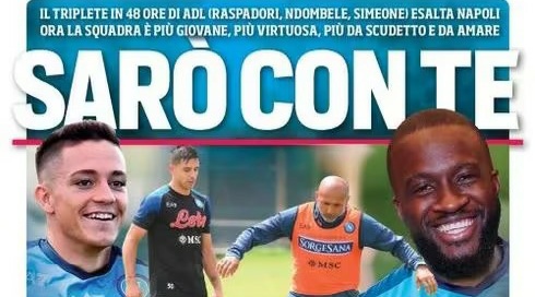 Il Corriere dello Sport, nell'edizione campana, apre con "Sarò con te". Il triplete in 48 ore di ADL (Raspadori, Ndombele, Simeone) esalta Napoli. Ora la squadra è più giovane, più virtuosa, più da scudetto e da amare. Ieri le visite mediche per il francese e il talento della Nazionale. Cholito in campo. Adesso Spalletti ha un gruppo "multitasking".