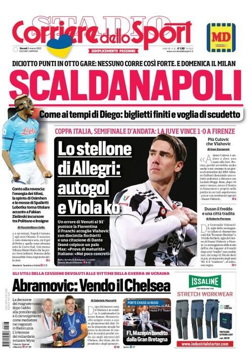 Il Corriere dello Sport edizione Campania, ha dedicato la prima pagina al Napoli e alla sfida contro il Milan: "ScaldaNapoli. Diciotto punti in otto gare: nessuno corre così forte e domenica il Milan. Come ai tempi di Diego: biglietti finiti e voglia di scudetto". C'è spazio anche per la Coppa Italia: "Lo stellone di Allegri: autogol e Viola k.o. Coppa Italia, semifinale d'andata: la Juve vince 1-0 a Firenze".