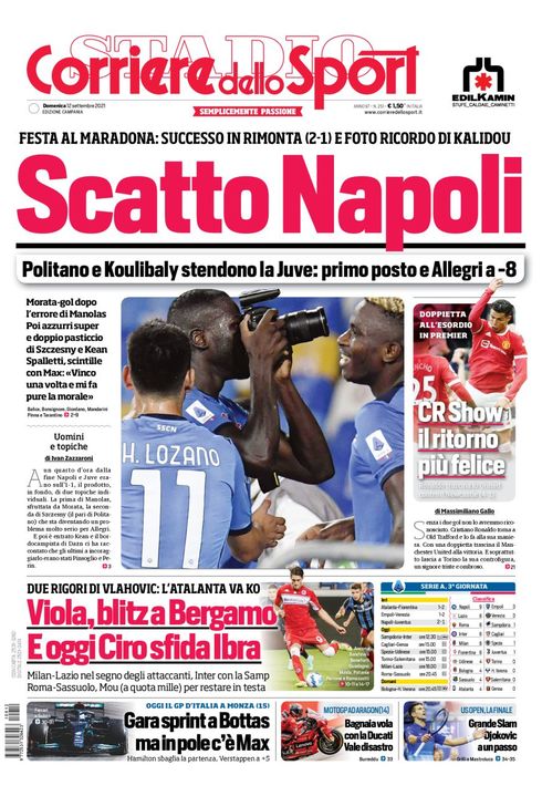 Il Corriere dello Sport, nella sua edizione Campania, apre con la vittoria degli azzurri: "Scatto Napoli. Politano e Koulibaly stendono la Juve: primo posto e Allegri a -8". "Morata-gol dopo l'errore di Manolas. Poi azzurri super e doppio pasticcio di Szczesny e Kean". Spalletti, scintille con Max: "Vinco una volta e mi fa pure la morale". In taglio basso la vittoria della Fiorentina contro l'Atalanta: "Viola, blitz a Bergamo" e il match Milan-Lazio: "E oggi Ciro sfida Ibra".