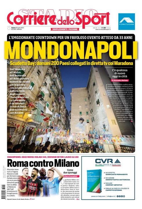 Il Corriere dello Sport, nell'edizione campana, apre con il match tra Napoli e Salernitana che potrebbe valere la vittoria dello scudetto per gli azzurri: "MondoNapoli. Scudetto Day: domani 200 Paesi collegati in diretta tv col Maradona. L'emozionante countdown per un favoloso evento atteso da 33 anni. Dall'America all'Africa, dall'Australia all'Asia: previsti numeri da record per la partita con la Salernitana. Salta il ritiro degli azzurri: l'hotel è sold out. La Juve tenta il ds Giuntoli: il club di DeLa può sostituirlo con Accardi".