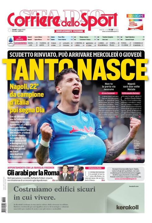 Il Corriere dello Sport, edizione Campania, dedica spazio in prima pagina al Napoli e al pareggio contro la Salernitana: "Tanto nasce. Scudetto rinviato, può arrivare mercoledì o giovedì. Napoli, 22' da campione d'Italia poi segna Dia".