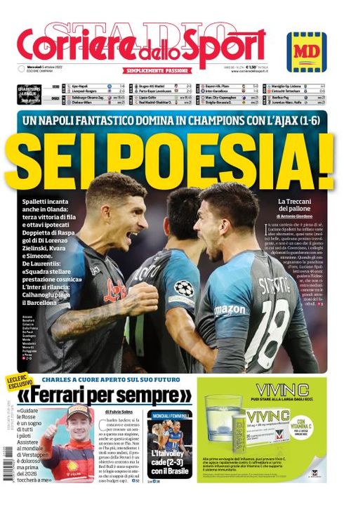 Il Corriere dello Sport, nell'edizione campana, apre con la vittoria per 1-6 in Champions League del Napoli contro l'Ajax: "Sei poesia! Un Napoli fantastico domina in Champions con l'Ajax (1-6). Spalletti incanta anche in Olanda: terza vittoria di fila e ottavi ipotecati. Doppietta di Raspa, gol di Di Lorenzo, Zielinski, Kvara e Simeone. De Laurentiis: "Squadra stellare, prestazione cosmica".