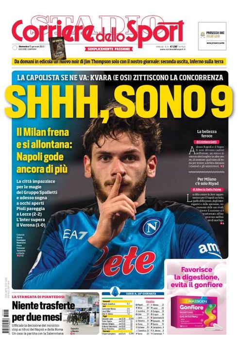 Il Corriere dello Sport, edizione Campania, dedica spazio in prima pagina al Napoli: "Shhh, sono 9. La capolista se ne va: Kvara (e Osi) zittiscono la concorrenza. Il Milan frena e si allontana: Napoli gode ancora di più".