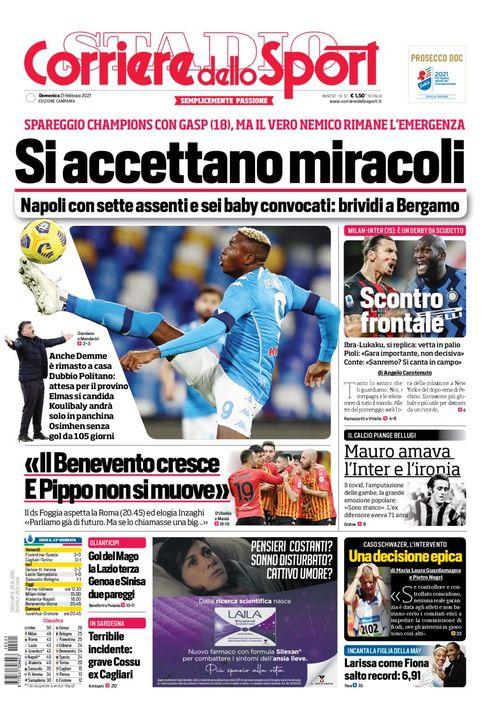 "Si accettano miracoli. Napoli con sette assenti e sei baby convocati. brividi a Bergamo", apre così l'edizione Campania del Corriere dello Sport in vista della sfida in programma domani tra gli uomini di Gennro Gattuso e l'Atalanta di Gasperini.
