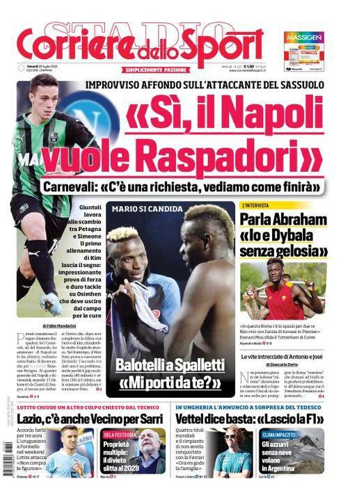 Il Corriere dello Sport, nell'edizione campana, apre con "Si, il Napoli vuole Raspadori". Improvviso affondo sull'attaccante del Sassuolo. Carnevali: "C'è una richiesta, vediamo come finirà". Giuntoli lavora sullo scambio tra Petagna e Simeone. Il primo allenamento di Kim lascia il segno: impressionante prova di forza e duro tackle su Osimhen che deve uscire dal campo per le cure. Spazio anche a Balotelli. Mario si candida, Balotelli a Spalletti: "Mi porti da te?". In basso, DeLa festeggia, proprietà multiple: il divieto slitta al 2028.