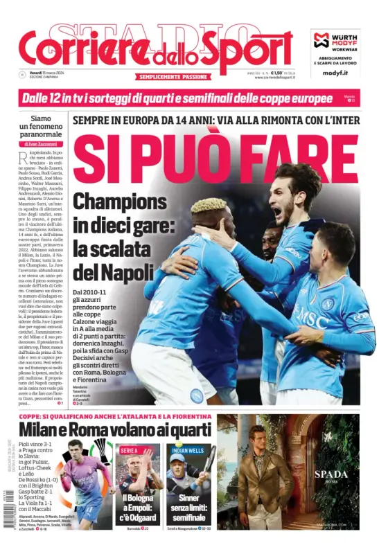 Il Corriere dello Sport, nell'edizione campana, apre con "Si può fare". Sempre in Europa da 14 anni: via alla rimonta con l'Inter. Champions in dieci gare: la scalata del Napoli. Dal 2010-11 gli azzurri prendono parte alle coppe. Calzona viaggia in A alla media di 2 punti a partita: domenica Inzaghi, poi la sfida con Gasp. Decisivi anche gli scontri diretti con Roma, Bologna e Fiorentina. In basso, Atalanta, Milan e Roma ai quarti di finale di Europa League, anche la Fiorentina continua la sua avventura in Conference League. Infine, il Bologna impegnato a Empoli e Jannik Sinner in semifinale a Indian Wells.