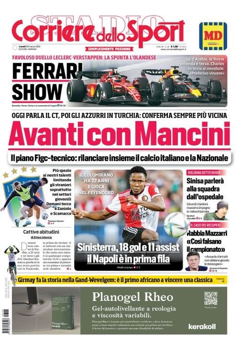 Il Corriere dello Sport, edizione Campania, dedica spazio in prima pagina all'Italia: "Avanti con Mancini. Oggi parla il CT, poi gli azzurri in Turchia: conferma sempre più vicina. Il piano FIGC-tecnico: rilanciare insieme il calcio italiano e la Nazionale". C'è spazio anche per gli obiettivi del Napoli: "Sinisterra, 18 gol e 11 assist, il Napoli è in prima fila. Il colombiano ha 22 anni e gioca nel Feyenoord". C'è anche spazio per il secondo e terzo posto delle Ferrari di Leclerc e Sainz: "Ferrari show. Favoloso duello Leclerc-Verstappen: la spunta l'olandese".