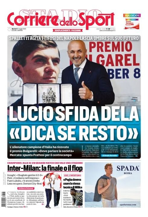 Il Corriere dello Sport, nell'edizione campana, apre con "Lucio sfida DeLa: "Dica se resto". Spalletti agita i tifosi del Napoli: lascia ombre sul suo futuro. L'allenatore campione d'Italia ha ricevuto il premio Bulgarelli: "Deve parlare la società". Mercato: spunta Frattesi per il centrocampo.