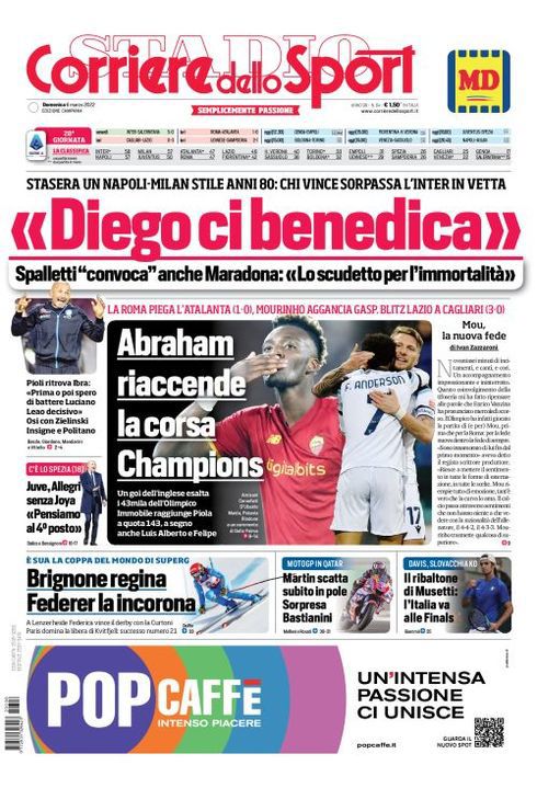 Il Corriere dello Sport, nell'edizione campana, apre con il match Napoli-Milan: "Diego ci benedica". Spalletti convoca anche Maradona: "Lo scudetto per l'immortalità". Un Napoli-Milan in stile anni 80: chi vince sorpassa l'Inter in vetta.