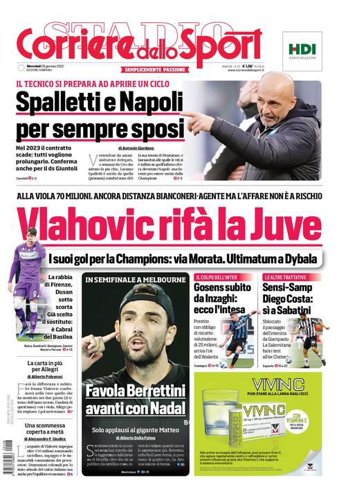 Il Corriere dello Sport, nell'edizione campana, apre con il grande feeling tra Spalletti ed il Napoli ed il suo possibile rinnovo di contratto: "Spalletti e Napoli per sempre sposi. Il tecnico si prepara ad aprire un ciclo. Nel 2023 il contratto scade: tutti vogliono prolungarlo. Conferma anche per il ds Giuntoli".