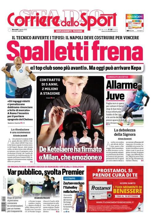 Il Corriere dello Sport, nell'edizione campana, apre con le parole dell'allenatore azzurro Luciano Spalletti: "Spalletti frena: "I top club sono più avanti". Ma oggi può arrivare Kepa. Il tecnico avverte i tifosi: il Napoli deve costruire per vincere. "Gli ingaggi ridotti ci penalizzano, dobbiamo rinunciare ad una fetta di mercato". A Roma l'incontro per il portiere spagnolo del Chelsea".