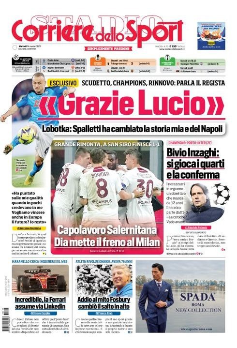 Il Corriere dello Sport, nell'edizione campana, apre con l'intervista al centrocampista azzurro Stanislav Lobotka: "Grazie Lucio". "Spalletti ha cambiato la storia mia e del Napoli". Scudetto, Champions, rinnovo: parla il regista. "Ha puntato sulle mie qualità, quando in pochi credevano in me. Vogliamo vincere anche in Europa. Il futuro? Io resto".