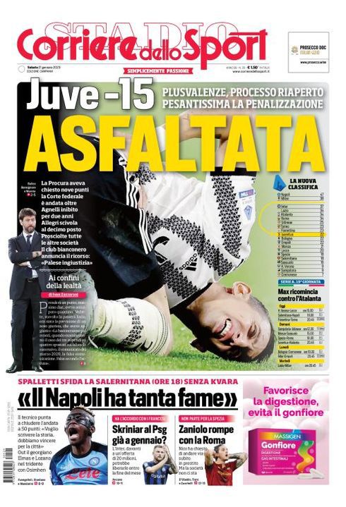 Il Corriere dello Sport, nell'edizione campana, apre con le parole dell'allenatore azzurro Luciano Spalletti alla vigilia del derby contro la Salernitana: "Il Napoli ha tanta fame". Spalletti sfida la Salernitana (ore 18) senza Kvara. Il tecnico punta a chiudere l'andata a 50 punti: "Voglio scrivere la storia, dobbiamo vincere per la città". Out il georgiano. Elmas e Lozano nel tridente con Osimhen".