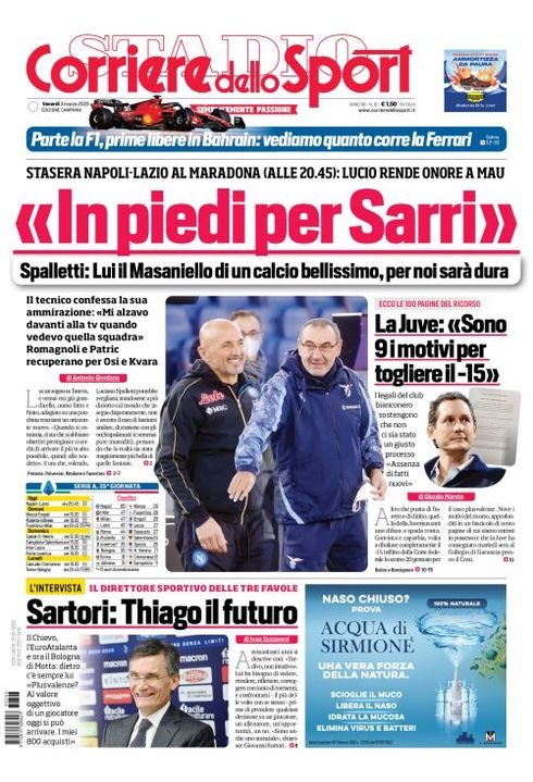 Il Corriere dello Sport, nell'edizione campana, apre con "In piedi per Sarri". Spalletti: "Lui il Masaniello di un calcio bellissimo, per noi sarà dura". Stasera Napoli-Lazio al Maradona (alle 20:45): Lucio rende onore a Mau. Il tecnico confessa la sua ammirazione: "Mi alzavo davanti alla tv quando vedevo quella squadra". Romagnoli e Patric recuperano per Osi e Kvara.