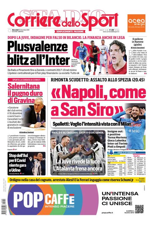 Il Corriere dello Sport, nell'edizione campana, apre con le parole in conferenza stampa di Luciano Spalletti alla vigilia della sfida del Maradona contro lo Spezia: "Napoli, come a San Siro, voglio l'intensità vista con il Milan". Rimonta scudetto: assalto allo Spezia (20:45). Insigne out: è positivo. Torna Mertens, gioca Lobotka. Inter col Torino, Pioli a Empoli".