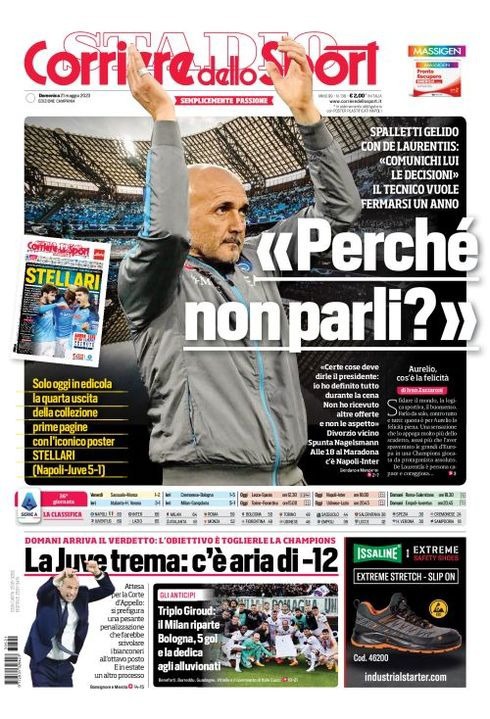 Il Corriere dello Sport, nell'edizione campana, apre con le dichiarazioni di Luciano Spalletti in conferenza stampa, alla vigilia del match con l'Inter: "Perchè non parli?". Spalletti gelido con De Laurentiis: "Comunichi lui le decisioni". Il tecnico vuole fermarsi un anno. "Certe cose deve dirle il presidente: io ho definito tutto durante la cena. Non ho ricevuto altre offerte e non le aspetto". Divorzio vicino. Spunta Nagelsmann. Alle 18 al Maradona c'è Napoli-Inter.