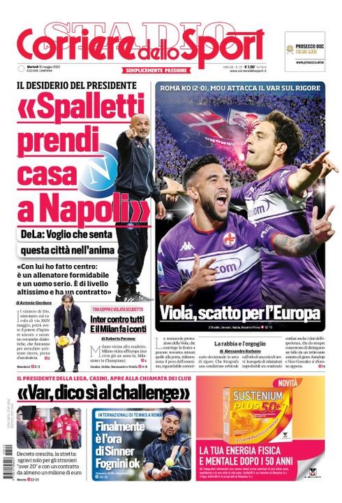 Il Corriere dello Sport, nell'edizione campana, apre con il desiderio del presidente Aurelio De Laurentiis: "Spalletti prendi casa a Napoli". DeLa: "Voglio che senta questa città nell'anima. Con lui ho fatto centro: è un allenatore formidabile e un uomo serio. E' di livello altissimo e ha un contratto".