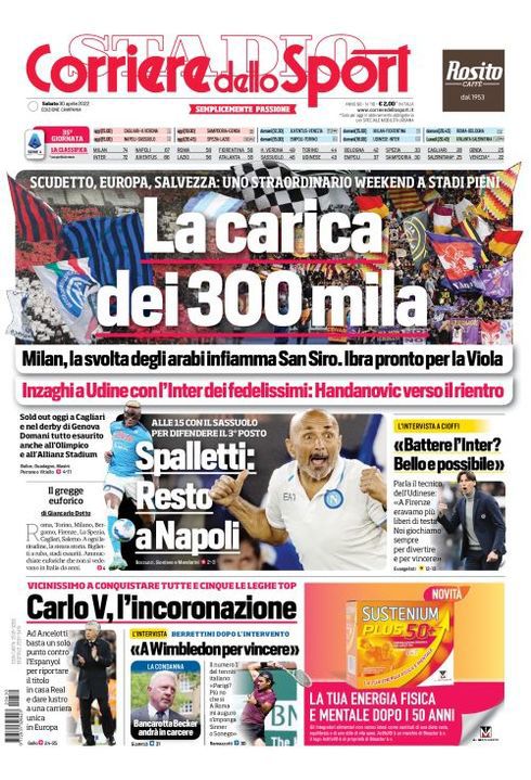 Il Corriere dello Sport, nell'edizione campana, apre con le parole di Luciano Spalletti in conferenza stampa alla vigilia del match contro il Sassuolo: "Spalletti: "Resto a Napoli". Alle 15 con il Sassuolo per difendere il 3° posto".