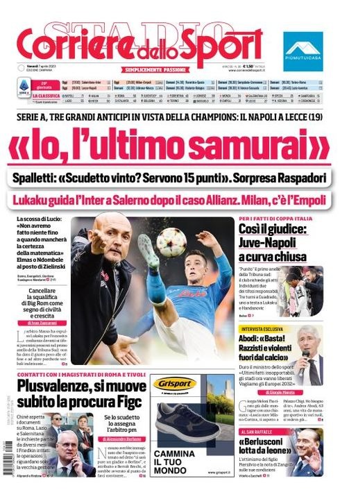 Il Corriere dello Sport, nell'edizione campana, apre con le dichiarazioni dell'allenatore azzurro alla vigilia del match contro il Lecce: "Io, l'ultimo samurai". Serie A, tre grandi anticipi in vista della Champions: il Napoli a Lecce (19). Spalletti: "Scudetto vinto? Servono 15 punti". Sorpresa Raspadori. La scossa di Lucio: "Non avremo fatto niente fino a quando mancherà la certezza matematica". Elmas o Ndombele al posto di Zielinski. Spazio anche ai fatti di Coppa Italia "Così il giudice: Juve-Napoli a curva chiusa".