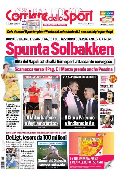 Il Corriere dello Sport, nell'edizione campana, apre con "Spunta Solbakken". Dopo Ostigard e Svanberg, il club azzurro guarda ancora al nord. Blitz del Napoli: sfida alla Roma per l'attaccante norvegese. Il talento del Bodo/Glimt si svincola il 31 dicembre: il ds Giuntoli offre 2 milioni per portarlo da Spalletti. Può diventare il sostituto di Politano.