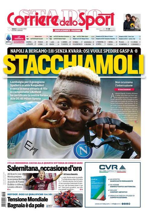 Il Corriere dello Sport, nell'edizione campana, apre con l'importante sfida tra l'Atalanta e il Napoli: "Stacchiamoli. Napoli a Bergamo (18) senza Kvara: Osi vuole spedire Gasp a -8. Lombalgia per il georgiano. Spalletti scalda Raspadori e cerca la nona vittoria di fila in campionato: "Anfield ha certificato la nostra forza". Alle 20:45 Milan-Spezia".