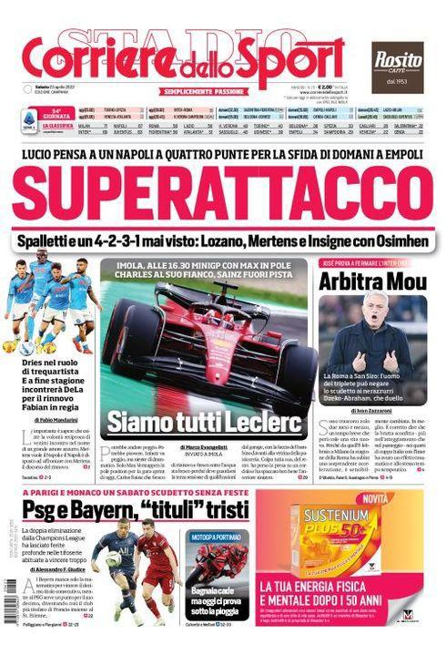 Il Corriere dello Sport, nell'edizione campana, apre con un'ipotetico schieramento del Napoli nella sfida contro l'Empoli: "Superattacco. Spalletti e un 4-2-3-1 mai visto: Lozano, Mertens e Insigne con Osimhen. Lucio pensa a un Napoli a quattro punte per la sfida di domani a Empoli. Dries nel ruolo di trequartista e a fine stagione incontrerà ADL per il rinnovo. Fabian in regia".