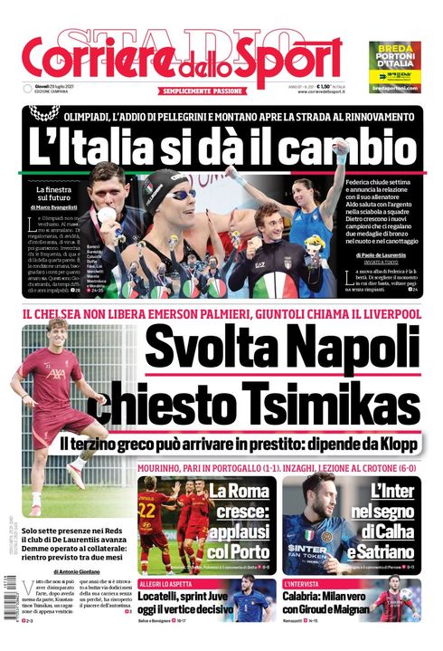 "Svolta Napoli, chiesto Tsimikas", titola l'edizione campana del Corriere dello Sport, che precisa: "Il Chelsea non libera Emerson Palmieri, Giuntoli chiama il Liverpool", "Il terzino greco può arrivare in prestito: dipende da Klopp". Poi approfondimenti sulle Olimpiadi e sui ritiri delle altre di A.