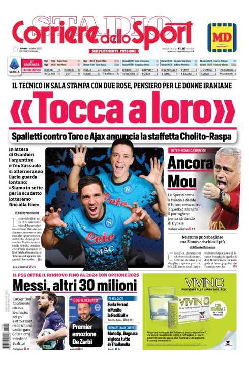 Il Corriere dello Sport, nell'edizione campana, aprre con le parole dell'allenatore azzurro Luciano Spalletti su Simeone e Raspadori in vista dei prossimi match del Napoli: "Tocca a loro". Spalletti contro Toro e Ajax annuncia la staffetta Cholito-Raspa. Il tecnico in sala stampa con due rose, pensiero per le donne iraniane. In attesa di Osimhen l'argentino e l'ex Sassuolo si alterneranno. Lucio guarda lontano: "Siamo in sette per lo scudetto, lotteremo fino alla fine".