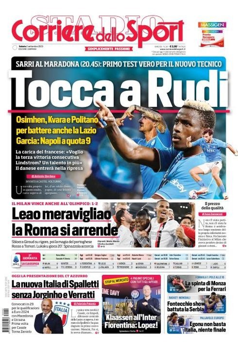 Il Corriere dello Sport, nell'edizione campana, apre con "Tocca a Rudi". Sarri al Maradona (20:45): primo test vero per il nuovo tecnico. Osimhen, Kvara e Politano per battere anche la Lazio: Garcia: "Napoli a quota 9". La carica del francese: "Voglio la terza vittoria consecutiva. Lindstrom? Un talento in più". Il danese entrerà nella ripresa. Spazio anche alla vittoria del Milan all'Olimpico: "Leao meravigliao, la Roma si arrende". In basso, la nuova Italia di Spalletti senza Jorginho e Verratti, l'arrivo all'Inter di Davy Klaassen e di Maxime Lopez alla Fiorentina.
