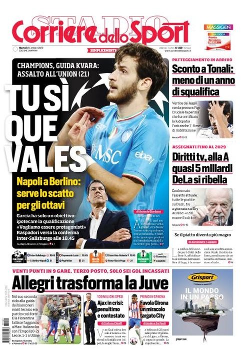Il Corriere dello Sport, nell'edizione campana, apre con "Tu si que vales". Champions, guida Kvara: assalto all'Union (21). Napoli a Berlino: serve lo scatto per gli ottavi. Garcia ha solo un obiettivo: ipotecare la qualificazione. "Vogliamo essere protagonisti". Raspadori verso la conferma, Inter-Salisburgo alle 18:45. Spazio anche per la questione scommesse "Sconto a Tonali: meno di un anno di squalifica". "Diritti tv, alla A quasi 5 miliardi. De Laurentiis si ribella". In basso, "Allegri trasforma la Juve". "Ajax in crisi: penultimo e contestato". "Favola Girona, un miracolo targato City".